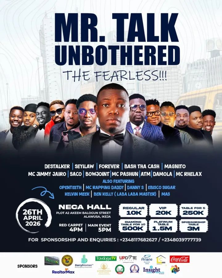 Nigeria’s comedy scene is heating up, and there’s one event that promises to deliver laughter, bold conversations, and unforgettable performances: “Mr Talk Unbothered – The Fearless Edition”. Set for 26 April at Neca House, Ikeja, Lagos, this fourth edition of the acclaimed comedy show is already generating buzz. Here’s why fans of good comedy should mark their calendars.