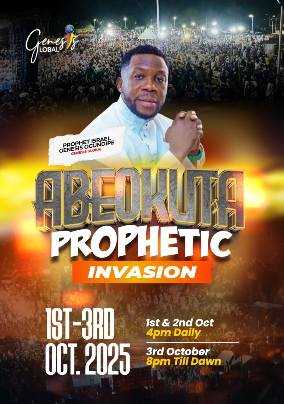 The Genesis Global Church is set to host the highly anticipated Abeokuta Prophetic Invasion from October 1st to 3rd, 2025 at Oba Odeleye Park, Shokori, Abeokuta, Ogun State. This three-day event promises to be a powerful encounter with God, bringing together believers from all walks of life. The event will take place daily at 4 pm on October 1st and 2nd, while the final night will be a special 8pm service till dawn on October 3rd.