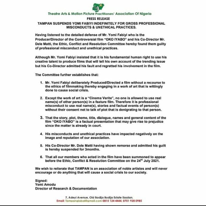 A new letter signed by Yemi Amodu, the director of research and documentation for TAMPAN claimed that the said cast are expected to appear before the Ethic, Conflict and Resolution Committee of the association on 24th, July 2021.