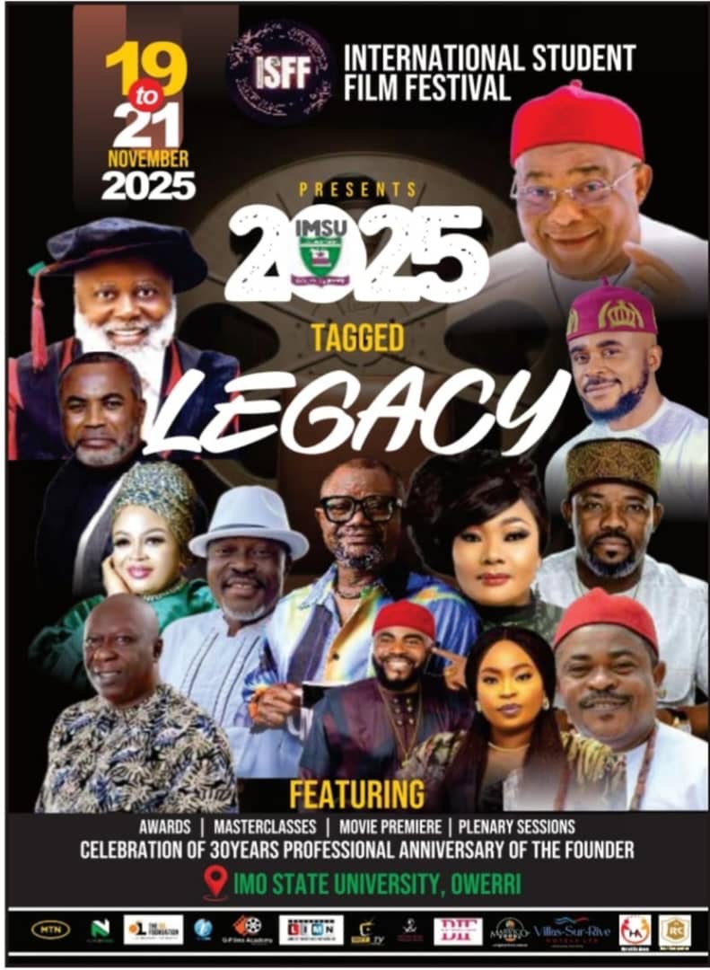 Imo State University, Owerri is hosting the 3rd edition of ISFF, the event will also special recognition awards for some top Nollywood greats including kanayo O kanayo, vitalis Ndubisi, Nkiru Slyvanus, Eucharia Anunobi, Chief Imo, and lots more. Lancelot Imasuen will be impacting on the young aspiring films with a master class