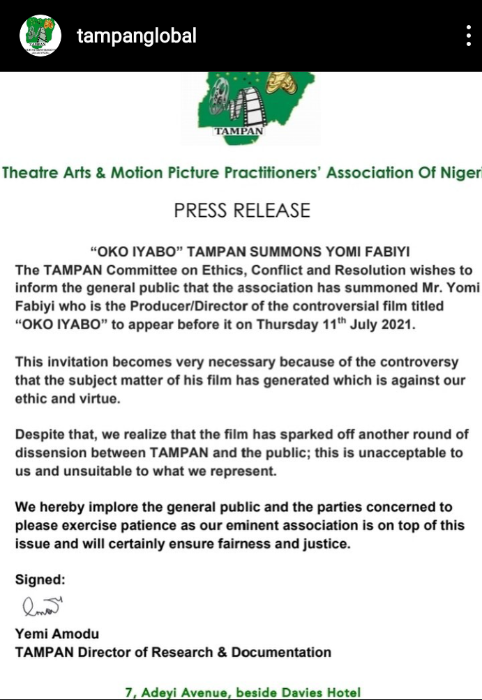 TAMPAN Summons Yomi Fabiyi For Producing Controversial Movie, “Oko Iyabo”